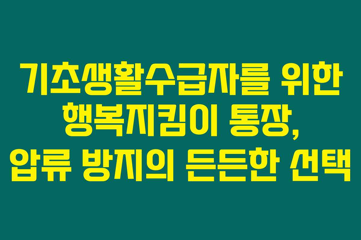 경제적 어려움에 처한 이들에게 행복지킴이 통장은 단순한 돈을 저장하는 공간 이상의 의미를 가집니다. 채무로부터 복지급여를 안전하게 보호해 주는 이 통장은 기초생활수급자와 같은 취약계층에게 희망의 빛을 가져다주죠. 저도 이 통장을 추천드리며, 적절한 활용 방법을 통해 더욱 안정된 생활을 이어가기를 바랍니다.