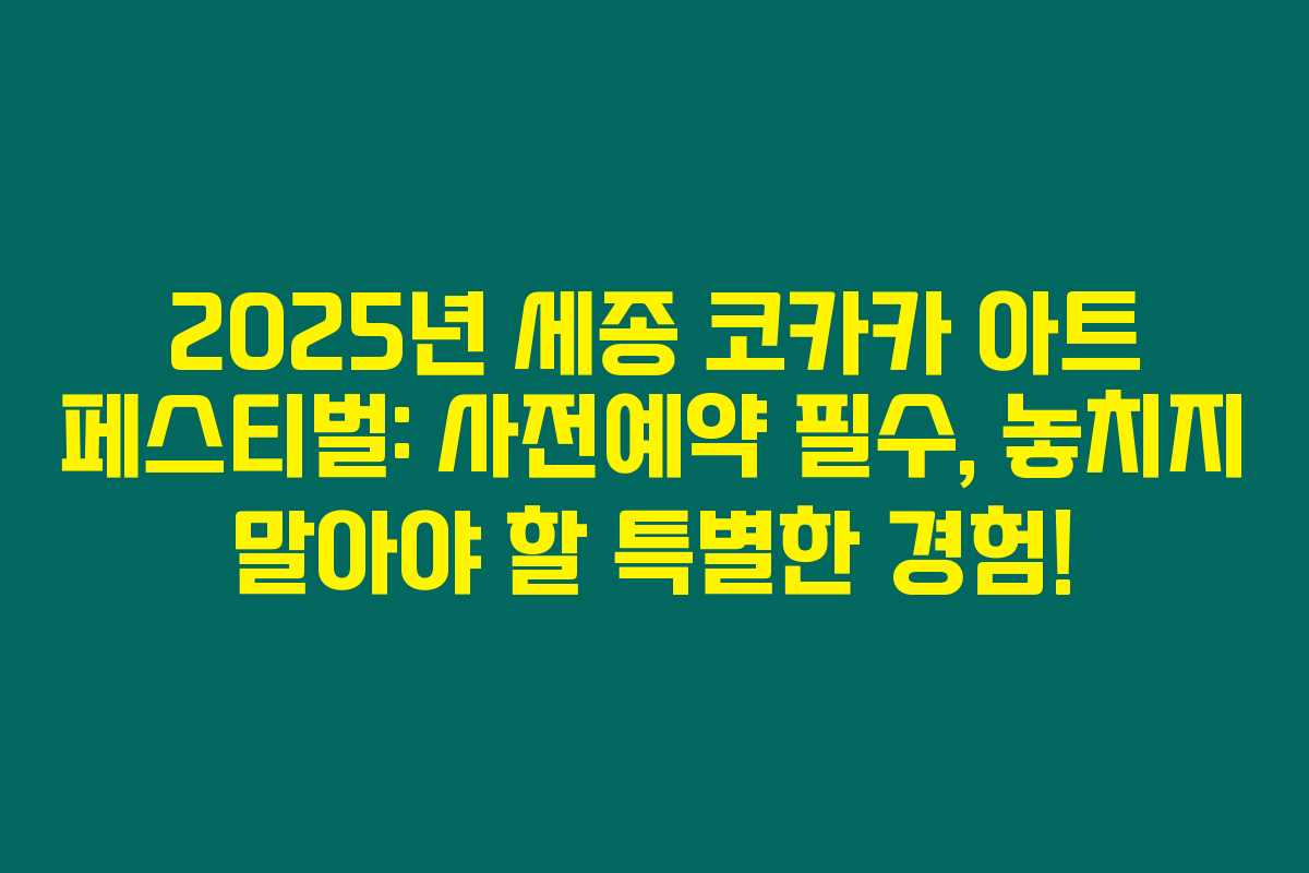 제가 직접 알아본 바로는, 2025년 세종 코카카 아트 페스티벌은 문화예술을 사랑하는 사람들에게 꼭 필요한 행사입니다. 이 행사는 청년 예술가부터 대중까지 참여할 수 있는 대규모 아트 페스티벌로, 다양한 공연과 워크숍이 준비되어 있어요. 특히, 특별한 경험을 선사할 프로그램은 사전예약이 필요하니, 아래를 읽어보시고 빠르게 예약하세요!