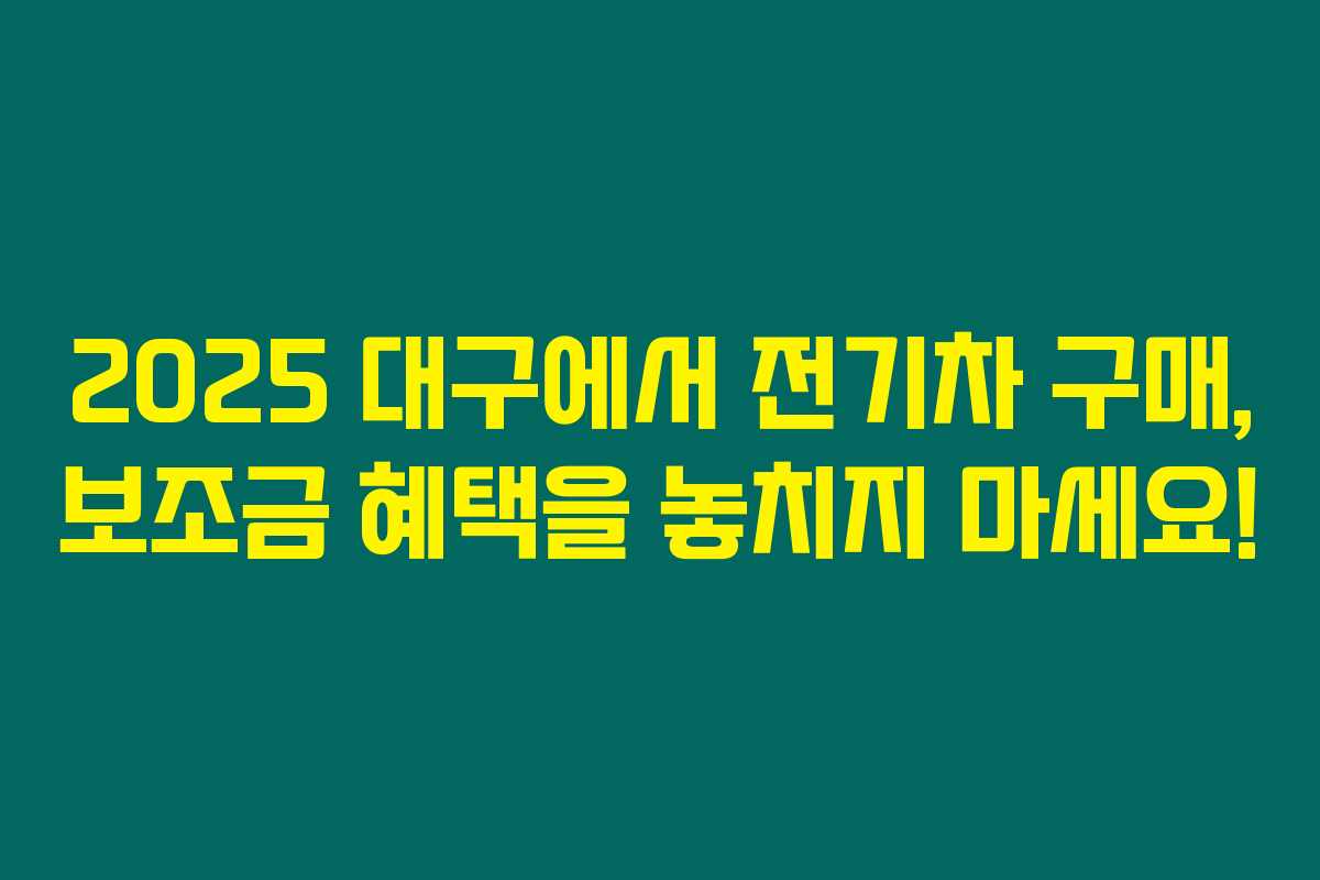 2025년은 대구의 전기차 보조금 덕분에 전기차 구매하기 좋은 시기입니다. 대구의 다양한 전기차 모델과 보조금 혜택을 통해 지구를 살리고, 내 지갑도 지키는 스마트한 선택을 해보세요. 아이오닉6와 GV60 같은 인기 모델들은 조기에 소진될 수 있으니 서두르세요! 😊🚗⚡