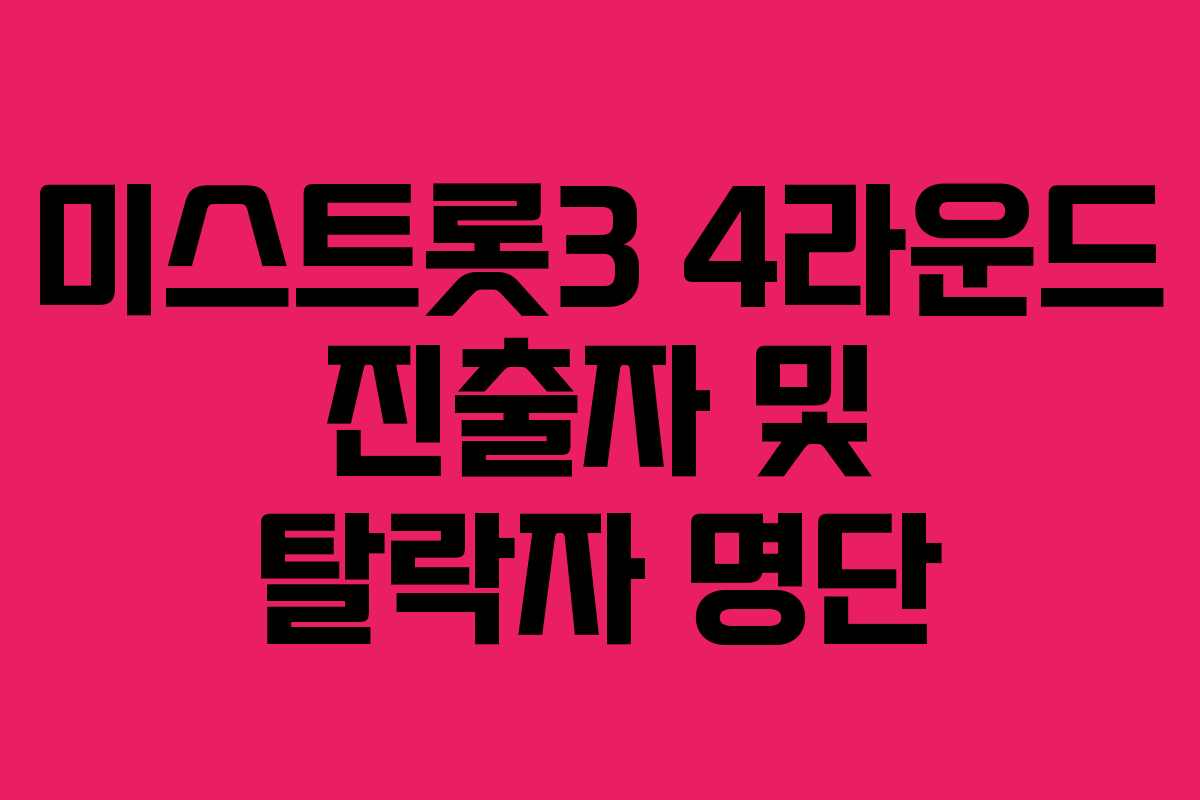TV조선의 인기 서바이벌 프로그램 <미스트롯 3>에서 4라운드 진출자가 확정되었습니다. 이번 방송에서는 1:1 데스매치가 진행되어 총 30명의 참가자 중 20명이 다음 라운드로 진출하게 되었습니다. 이번 글에서는 4라운드 진출자 명단과 탈락자 정보를 자세히 살펴보겠습니다.