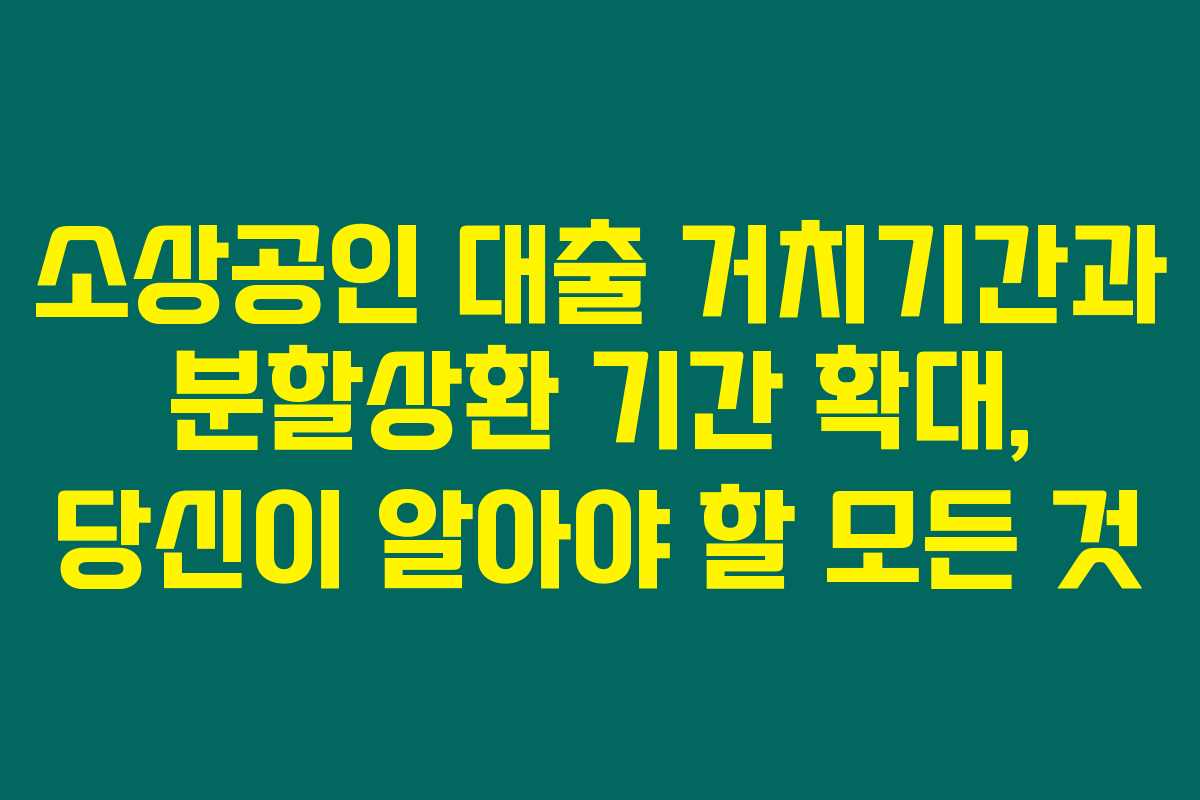 제가 직접 리서치한 바로는, 소상공인을 위한 대출의 거치기간과 분할상환 기간이 확대됨에 따라 많은 소상공인들이 경제적 부담을 덜 수 있는 기회를 얻고 있습니다. 아래를 읽어보시면, 이러한 변화가 어떤 의미가 있을지, 어떻게 활용할 수 있는지를 자세히 알 수 있습니다.